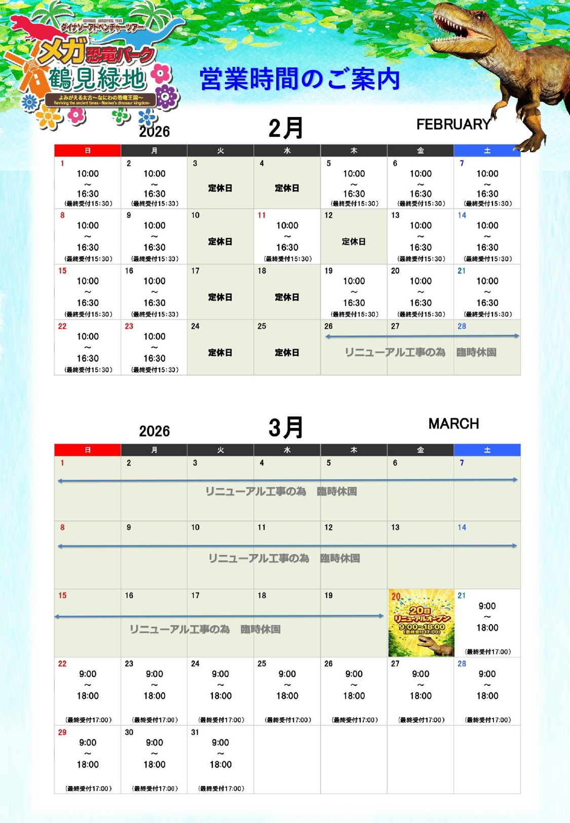 2026年2月24日(火)~3月19日(木)まで 恐竜パークリニューアル工事の為休園とさせていただきます。